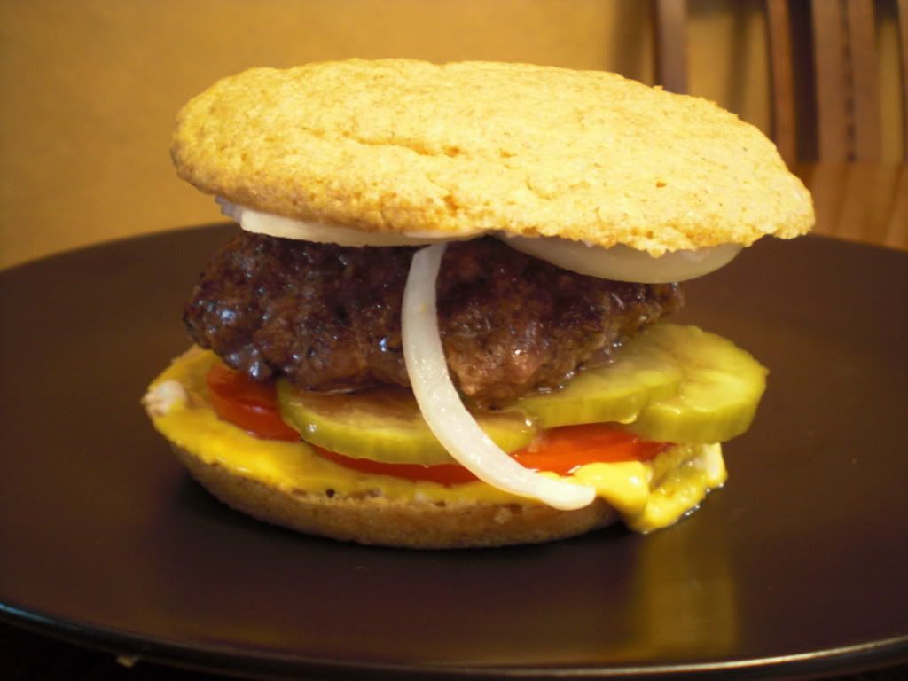 All of this has to go on a good Hamburger Bun. Now here we have a problem. I have been experimenting for weeks trying to come up with a good replacement for the classic Hamburger Bun. Some of my attempts have ended up more like corn bread in texture. Others were more like tasteless rice crackers or dry angel food cake. Finally this morning I managed a reasonable candidate. This is more like a whole grain bun in its look and feel, but at least it is tender and neither crumbly or dry. It stands up well to the other ingredients of the burger without falling apart after the first bite. I think this will do nicely.