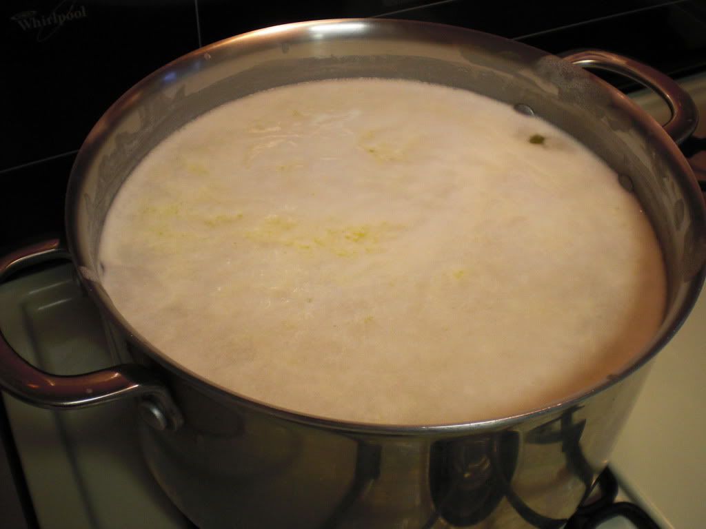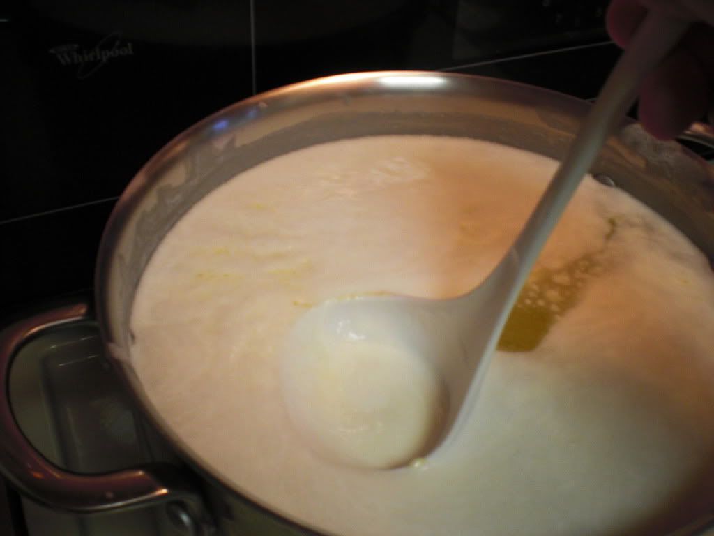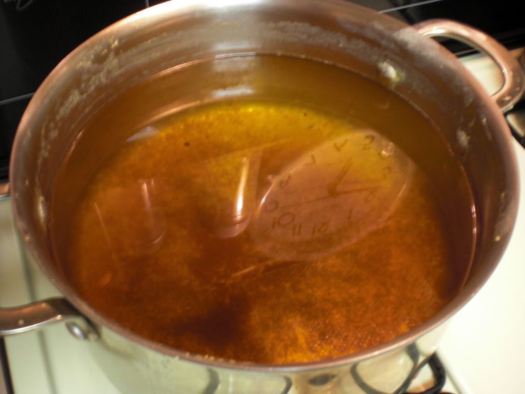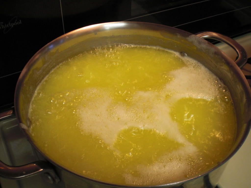 All this butter goes onto my big stainless steel kettle over a medium flame to melt. As the butter melts a white foam will rise to the top which I ladle off carefully trying not to discard any of the butter oil underneath it. By skimming gently I can pull off the foam as it forms.