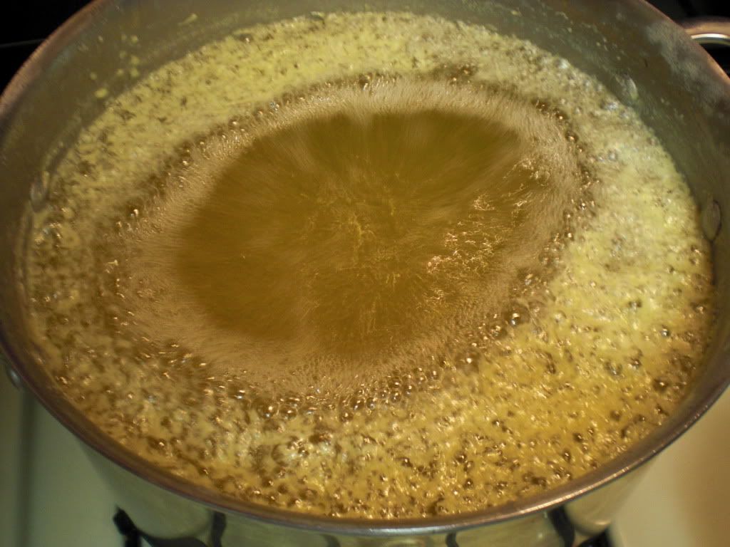 Once all the cubes of butter melt, the butter will begin to boil. This is because there is a lot of water in the butter. We want to boil all this water out of the oil because it is in the water that bacter ia and mold can grow. The trick to making ghee is to b