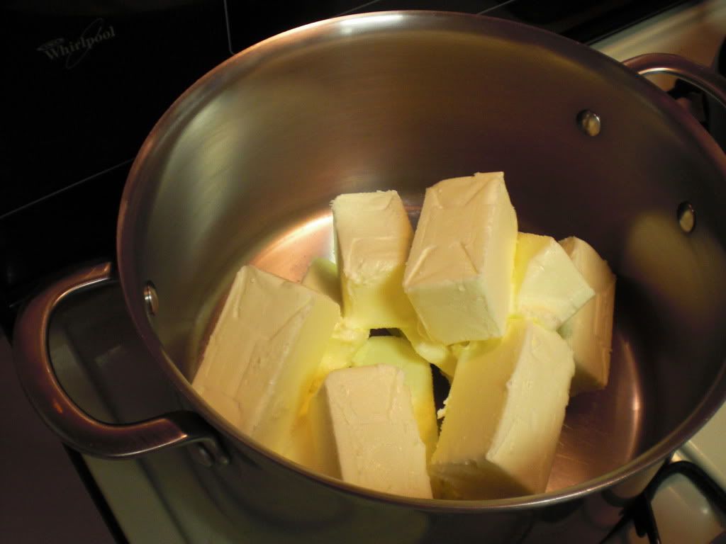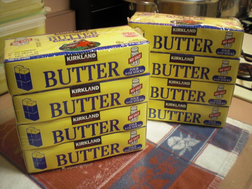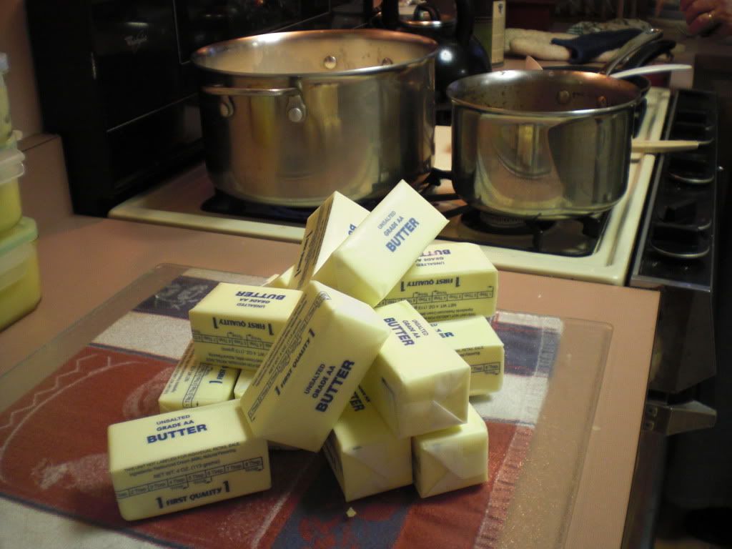 First I start out with unsalted butter. If you can find butter in bulk or 1 pound blocks the first step is much less tedious. Here I unwrapped 48 cubes of butter (12 pounds).