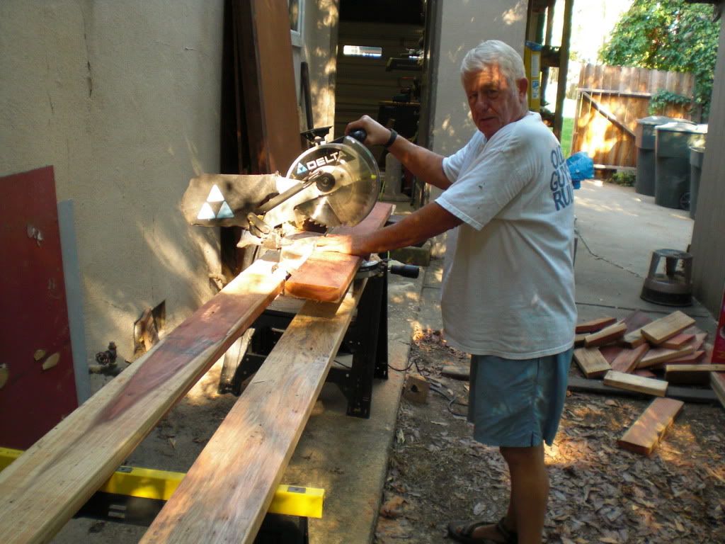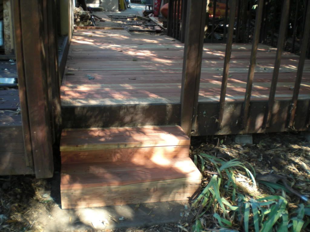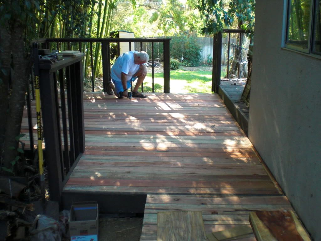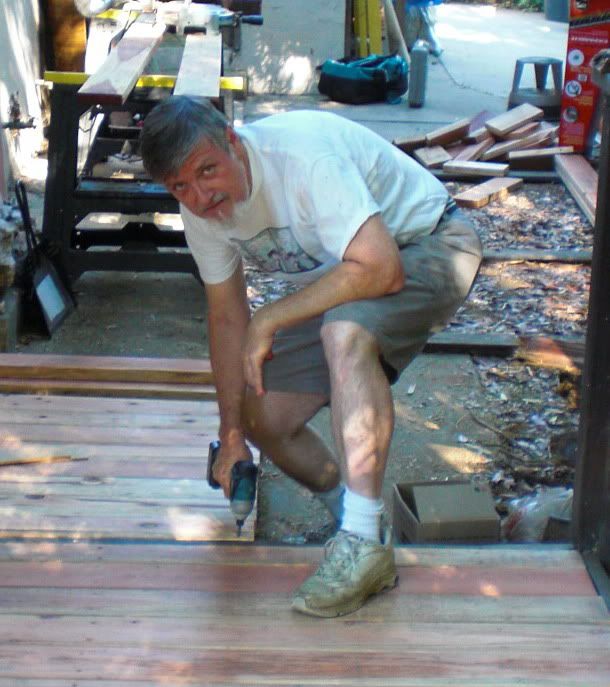 This last week my home project has been to reconstruct the side deck on my house. The support beams and many of the top boards had rotted through and were no longer safe to walk on. I tackled stripping the old deck away two weeks ago, which entailed pulling out about 200 four-inch nails. Fortunately my friend Dr. Fisher offered to help me with the rebuilding of the deck. We went down to the lumberyard and bought some 4x6 treated beams and spent most of Saturday a week ago rebuilding the substructure of the deck. I had placed an order for the redwood deck material for delivery Monday.