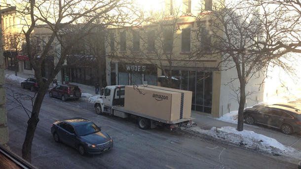This is one of those "a picture is worth a thousand words" moments. Amazon is delivering a new Nissan car to someone. It is a publicity stunt as Amazon is not permitted to actually sell cars, but the picture is great.