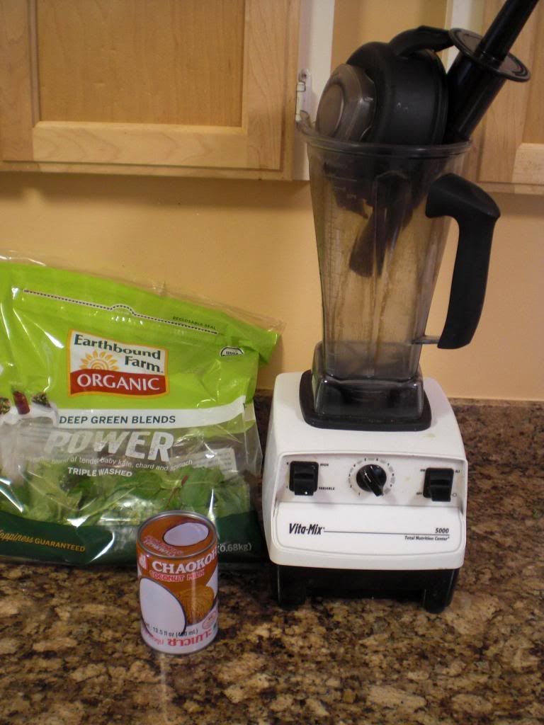The first step was to use about a third of a cup of coconut milk to make the smoothie smooth and creamy. Protein powders tend to stick in your throat without a little creaminess to move them along. I added 3 cups of purified water to the coconut milk and mixed it up in the blender. Next, I grabbed about 3 packed cups of a mixture of baby kale, spinach, and chard. This is the secret - baby greens are not nearly as bitter or grassy tasting as their grownup counterparts. I smashed this into the blender and turned it on high until everything was smooth.