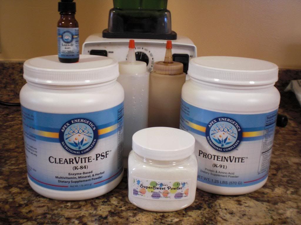 Protein was next, so I used a scoop of Clearvite protein powder and a scoop of a new protein amino acid blend called Proteinvite. This balances the protein into a perfectly digested and utilized ratio of amino acids. Just as easily you could add 4 ounces of cooked chicken or turkey breast instead of expensive protein powders. This may sound strange, but you will be amazed how well the meat disappears into the smoothie. For sweetness I added 2 teaspoons of my 8X sugar replacement and 1 tablespoon of vegetable glycerin. The glycerin is used by my body to carry nutrients into my cells. For a little flavor I added a couple teaspoons of vanilla. I also boost the nutrition with our liquid vitamin D.