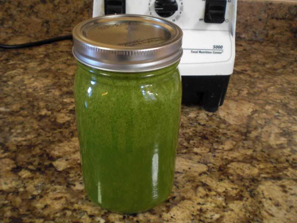 Another round of blending and the final product was ready. It looks very green and very healthy. All those raw leafy greens are just chock full of phytonutrients and other good stuff. Plus having the blender break down the cell walls makes the nutrients available to me. Too often the nutrients in plant foods never get into us because we don't have the enzymes necessary to break open the cell walls to let them out. Chewing breaks down 10 to 20% of the walls but the rest just pass on through.