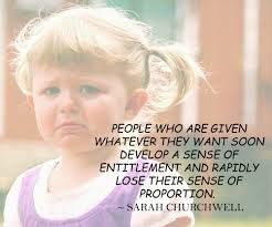 Entitlement is the direct byproduct of giving people stuff they want without requiring an equal exchange of effort for what they receive. This distortion of natural balance and the laws of cause and effect begins at an early age. It begins with giving in to the two year old in the grocery cart insisting they must have that particular candy or cereal or toy as you are shopping and gets reinforced with our shopping insanity at Christmas and birthdays. We are taught to believe in the ability to get something for nothing by our parents not understanding the consequences of their well-meaning actions. And this is where the change has to take place to bring balance back into our society.