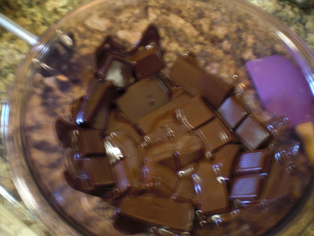 Step 2: Break up the chocolate into a microwave safe bowl and melt in the microwave 30 seconds at a time until the chocolate is about 2/3 melted. You could also use a double boiler on the stovetop. Don't melt the chocolate completely. It needs to be lumpy to maintain its temper. If you don't know about chocolate temper, don't ask - it is a total pain in the you-know-what.