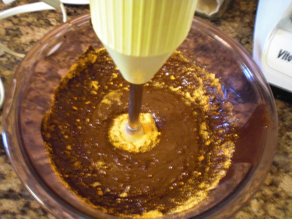Step 3: With a wand blender or hand mixer, blend the chocolate until smooth, then add the packet of herbs and blend it into the chocolate.
