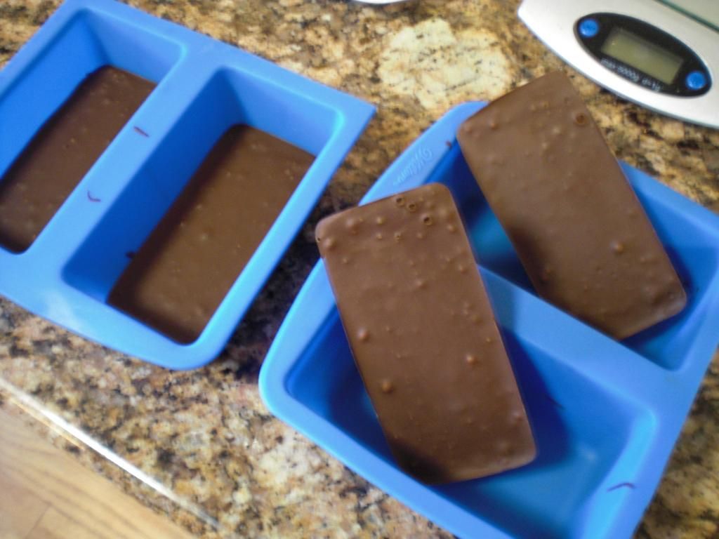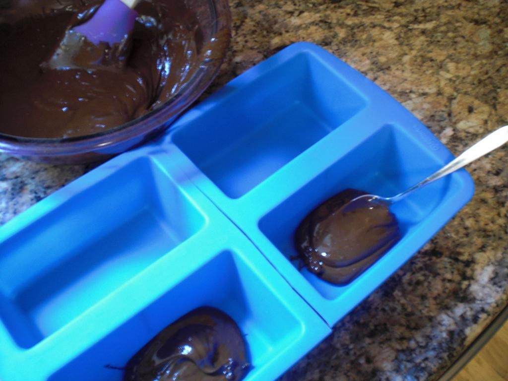 Step 4: Spoon out equal amounts of the chocolate mixture into each of the silicone molds. If you don't have molds, you can pick them up here, or in a pinch just use an 8X8 cake pan lined with plastic wrap.