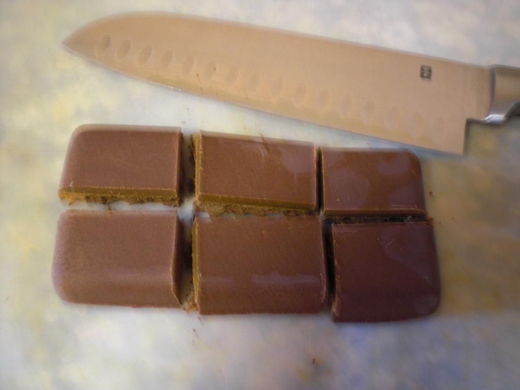 Step 6: Once the chocolate has set out long enough to come to room temperature it will cut fairly easily. If you are using the mini bread pan molds, cut each piece into six equal smaller pieces. If you are using the bigger pan, then cut the whole piece into quarters and then cut each quarter into six equal smaller pieces.