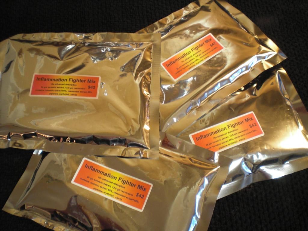 Well, I have been playing around at home trying to find a way to get turmeric extract and resveratrol into my system at higher quantities in a tasty manner. I have purchased the powdered turmeric extract, resveratrol, and pepper extract and have blended them into chocolate to form a yummy chocolate treat with twice the inflammation fighting power per dose. Put another way, I have figured out a way to cut the cost in half for the benefits of these powerhouse inflammation fighters.