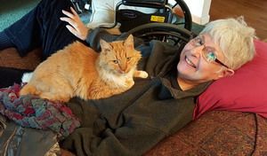 Here is Ellen on New Years Day engaging in one of her favorite activities - being a cat mat. Any time she lays down in her recliner, Zeal the cat plops himself down on her chest for a nice nap. Several times a day he will stand on the chair and demand his personal chair warmer Ellen come lay down to keep him company.