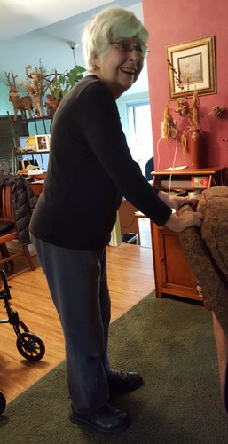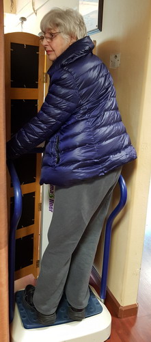 increased impact protocol. I had her go up on her toes and then simply drop down onto her heels. That is as much impact as we should do with her since she has already had one spontaneously broken hip due to osteoporosis. The trick now is to convince her to do this little exercise many times a day.