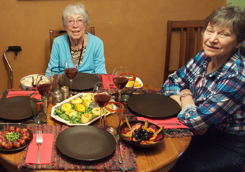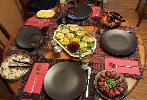 bacon roses, a bowl of pickled vegetables, and a pan of paleo sugar free cinnamon rolls. This was complimented with a mix of pomegranate and cherry juice as a beverage. Dessert was left over sugar free peanut butter cup eggs that I had made for my grand kids. Everything was delicious and a good time was had by all.