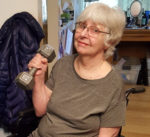 Ellen has decided she wants to push her envelope with her recovery by really working on her muscles. She is engaging people to work with her every day as trainers to keep her motivated. Here she has increased her arm strength to be able to pump 12 pounds on her good side and 6 pounds on her weak side.
