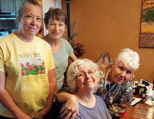 It was party time last week. Ellen threw a birthday party for her sister Chris. Here we see Ellen and Chris along with Susan McDonald, the massage therapist from the office, and Linda Edwards, the artist doing the fabric art pieces currently in the office.