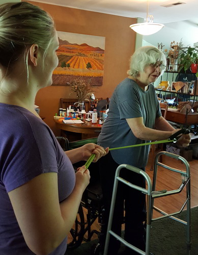 It looks like Ellen has discovered rubber! The arms need working out just as much as the legs. Kim is working Ellen with resistance tubing to work the stroked left arm.